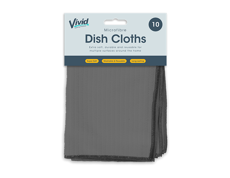 Each pack comes with ten individual dish cloths that are made from super soft microfibre polyester, measure L30 x W30cm each and are long lasting, washable and reusable.