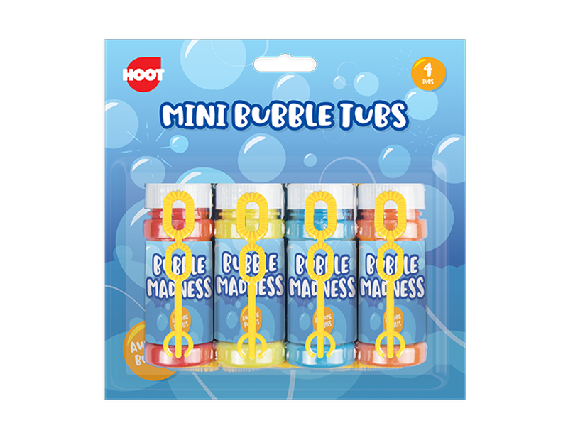 This pack of Mini Bubble Tubs contains four individual tubs, each holds 50ml of liquid and comes complete with a blowing wand.