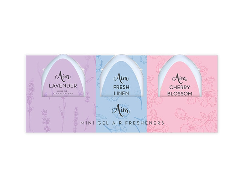 This pack of Mini Gel Air Fresheners contains three individual air freshener units that each measure 6.4cm x 5cm x 3.8cm and feature scents lavender, fresh linen and cherry blossom.