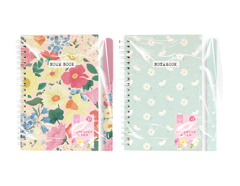 These handy A5 Wiro notebook & pen sets contain an A5 pad containing sixty sheets of 70gsm white lined paper and a plastic biro pen with blue ink.