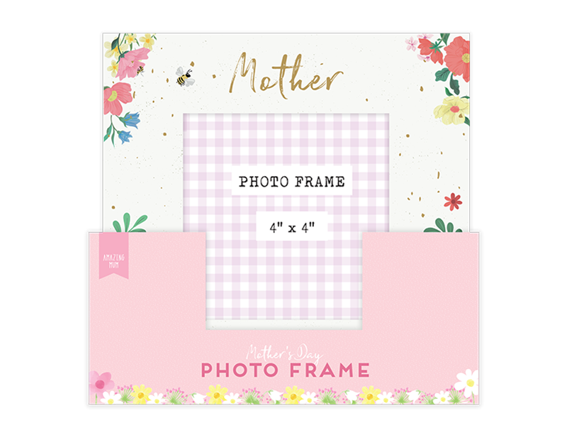These frames hold a 4 x 4" photograph, and have a colourful floral design with the word "Mother" printed at the top, and a typewriter style text slogan reading "side by side or miles apart, we'll always be connected by heart". The frames come fitted with a stand on the back.