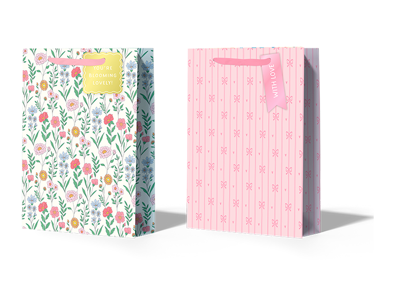 Medium Mother's Day gift bag, with beautiful and elegant designs crafted from strong and sturdy paper with a ribbon handle. Each carton contains two assorted designs.