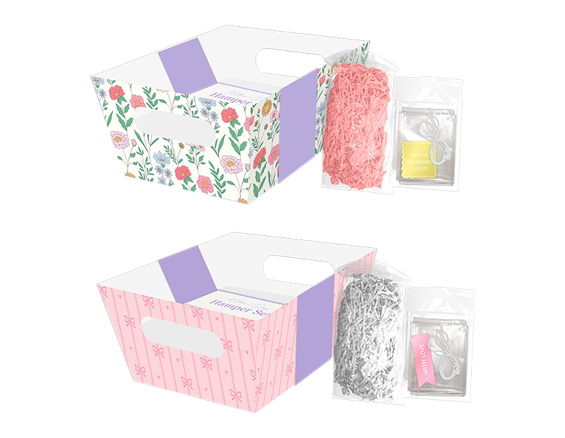 Each hamper measures L18 x W23 x H9cm, has carry handles and comes with ribbon, tissue paper, gift tag and celophane to create that classic hamper look. Each carton comes with two assorted designs.