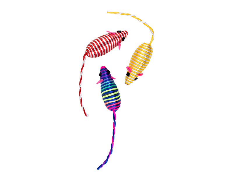 Each set comes with three mice in red, yellow and rainbow. Each mouse is tough and durable, and manufactured to withstand cats claws and teeth.
