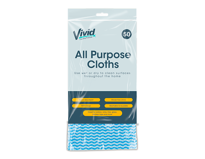 This pack of Multi-Purpose Cloths contains 50 extra large clothes that measure 32cm x 32cm. All-purpose clothes can be used both wet or dry and are super absorbent, washable, and reusable.