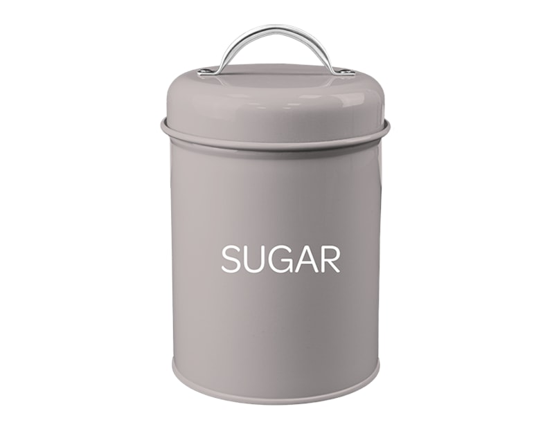 Each cylindrical jar measures H18cm x 11cm DIA, in a solid natural colour with 'SUGAR' printed on the front, with a matching coloured lid with silver handle to keep contents secure.