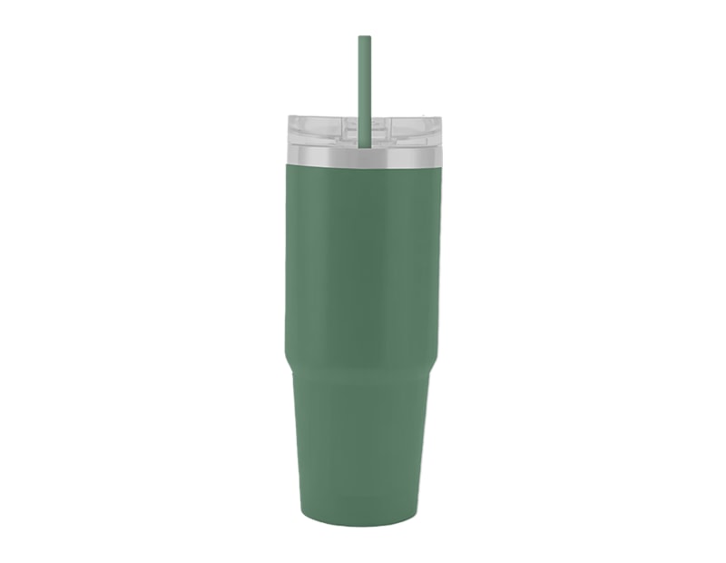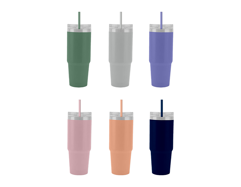 Each tumbler measures H21.5cm x 9cm diameter with a 650ml capacity, and comes with a L26.5cm straw. The tumblers feature an insulated stainless steel construction to keep drinks at desired temperature for up to 3 hours, a screw top lid with sliding cover, and a removable straw in matching colour.