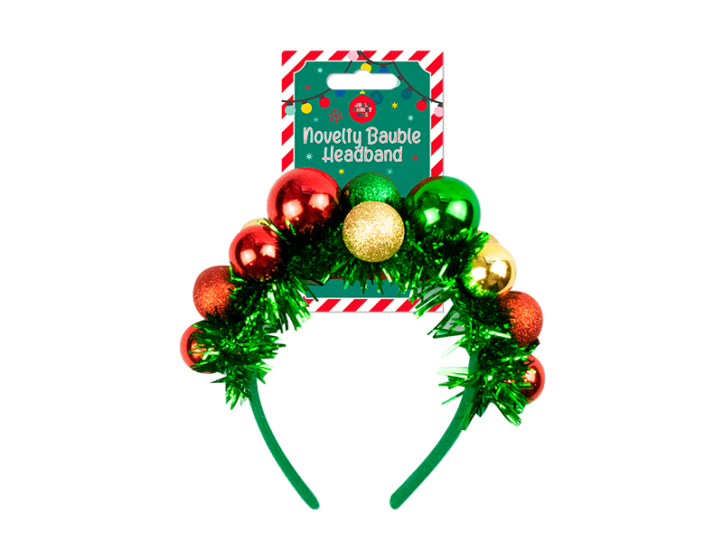 This Novelty Bauble Headband features 10 baubles in red, green and gold, a string of green tinsel built onto a comfortable fabric covered band.