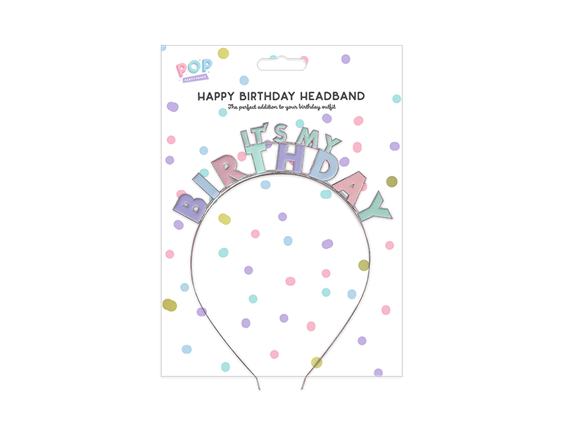 The headband is made of a gold coloured metal and resin and reads the words 'IT'S MY BIRTHDAY' in a vibrant mix of pastel colours.