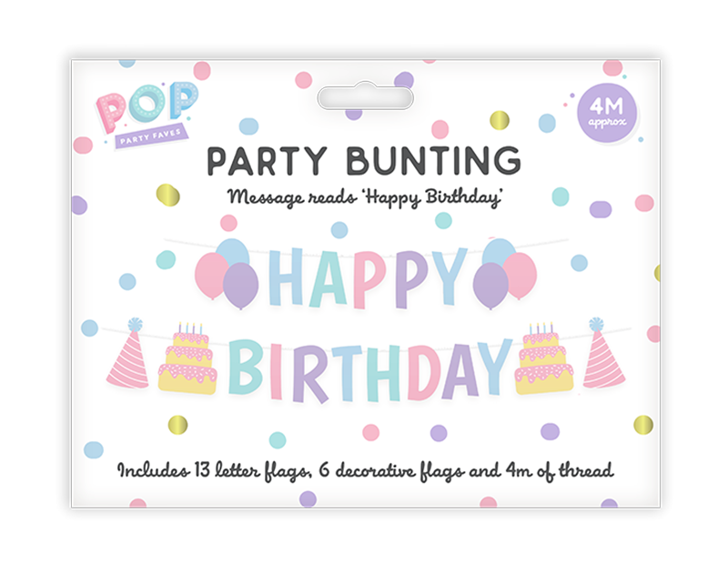 Add a pop of colour to birthday parties with this beautiful party bunting. This pastel decoration reads 'Happy Birthday' with cake, balloon and party hat flags and is ideal for decorating tables, walls, doorways and much more.