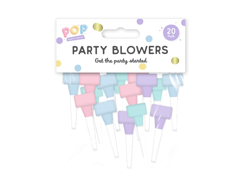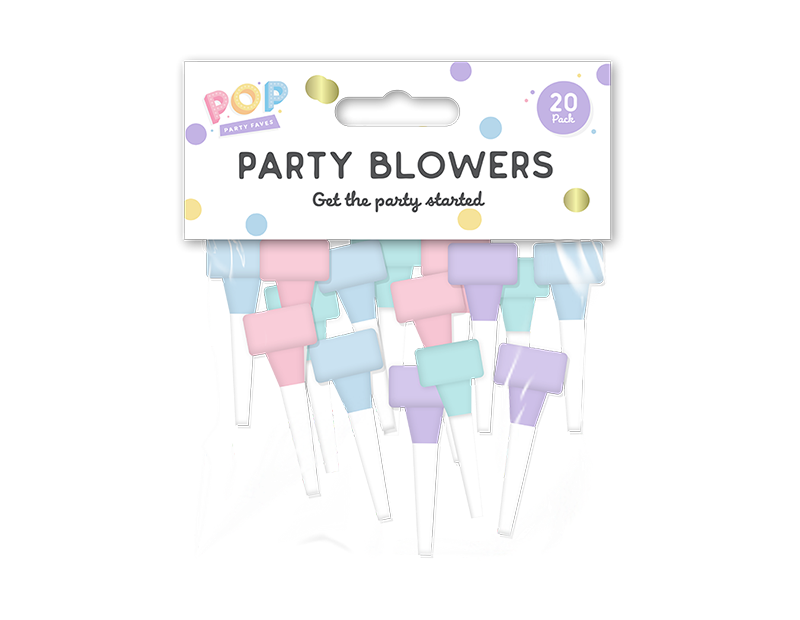 Each pack comes with twenty individual party blowers, each in an assorted pastel colour.