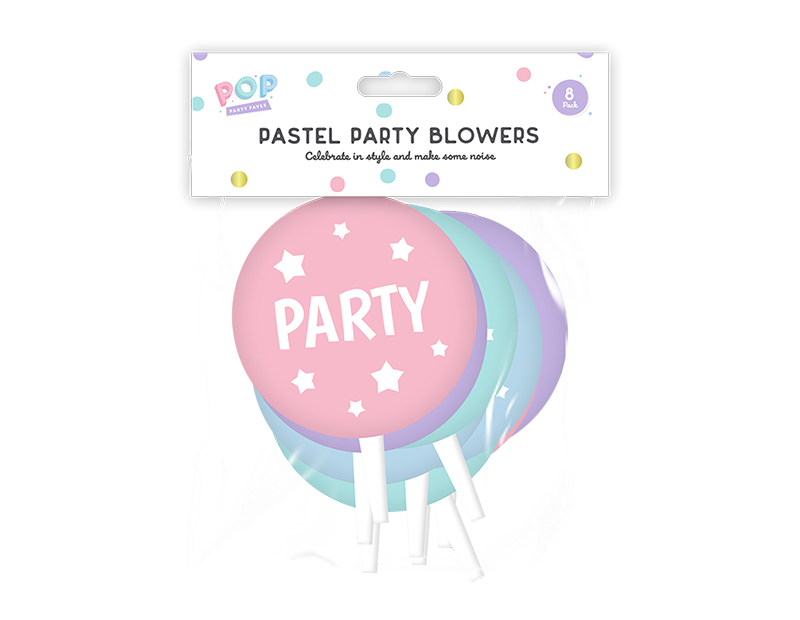 Each pack comes with eight individual party blowers, each with a card cover in an assorted pastel colour.