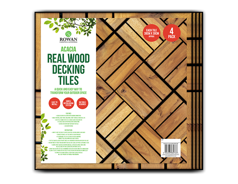 Each tile is made up of a 30 x 30cm square acacia wood decking, and features a flexible base with interlocking connectors. Water can drain away between the tiles easily.