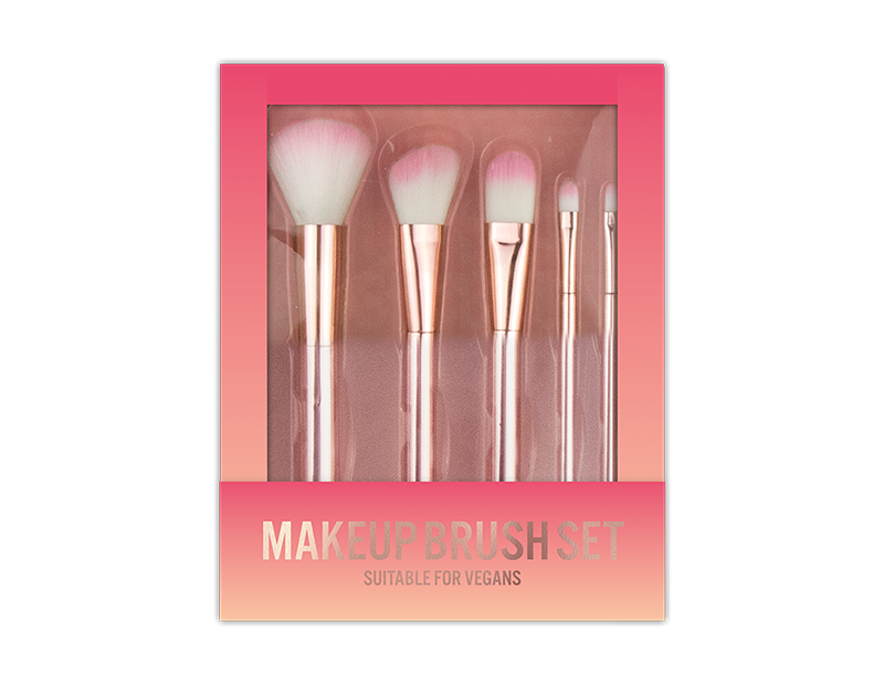 The set includes, x1 powder brush, x1 angled foundation brush, x1 foundation and concealer brush x1 eyeshadow brush x1 lipstick brush.