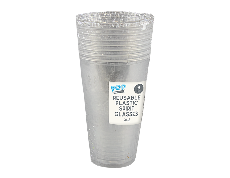 Each pack contains eight plastic spirit glasses and will hold 70ml of liquid.