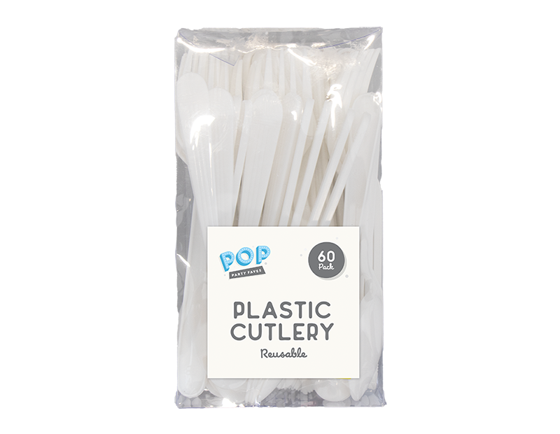 Plastic white cutlery set containing 60 food-grade plastic knives (x20), forks (x20) and spoons (x20).