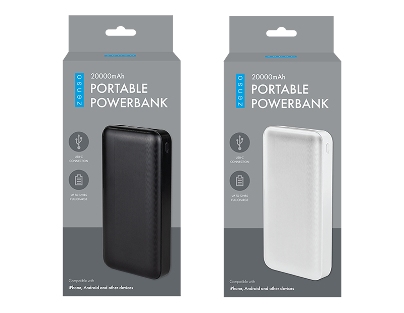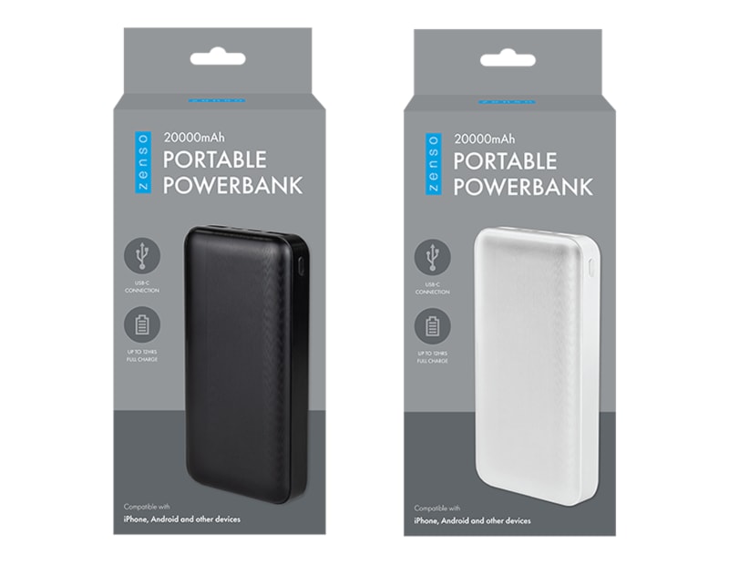 Compatible with iPhone, Android and other devices including smartphones and tablets. Each carton contains an assortment of black and white power banks.