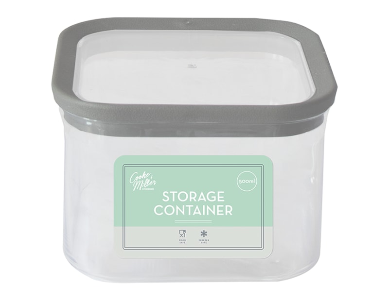 This PS square storage container features a clear PS body with a rubber trimmed lid and is perfect for storing a wide range of food types.