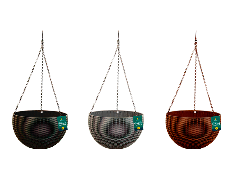 Constructed from plastic and designed with a rattan effect, each hanging basket measures 26cm in diameter (10" approx), and features a drainage plug on the base and three black metal chains attached to a hanging hook.