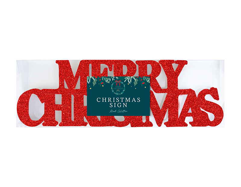 This Red Merry Christmas Glitter Sign features a durable glittered foam construction and is a free standing decoration.