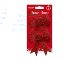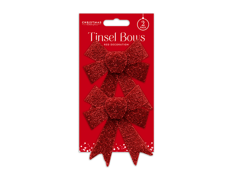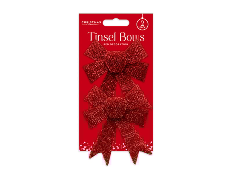This pack of Red Glitter Tinsel Bows contains two individual bows that measure L17 x W13cm. Perfect for fixing to Christmas trees and various places around the house that could use a touch of traditional festive glamour.