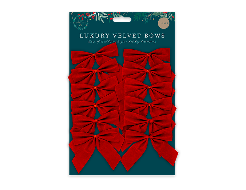 This pack of Red Velvet Christmas Bows contains twelve individual bows that are constructed from velvet and would be ideal for decorating presents, Christmas trees and around the home.