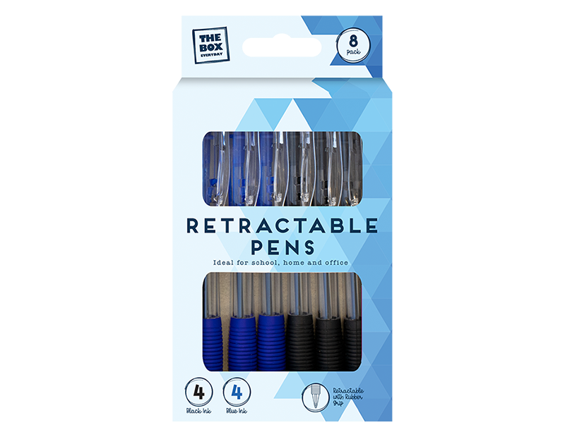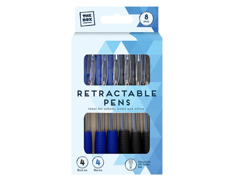 Retractable ballpoint pens containing eight pens that feature a smooth flow of ink in blue and black. Ideal for school, home and office.