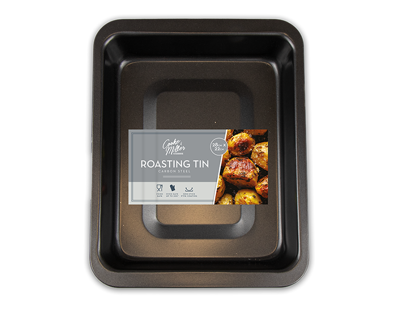 This roasting tin is 28cm x 22cm and is made of carbon steel. It also has a non stick PTFE coating to make roasting and cooking easier.