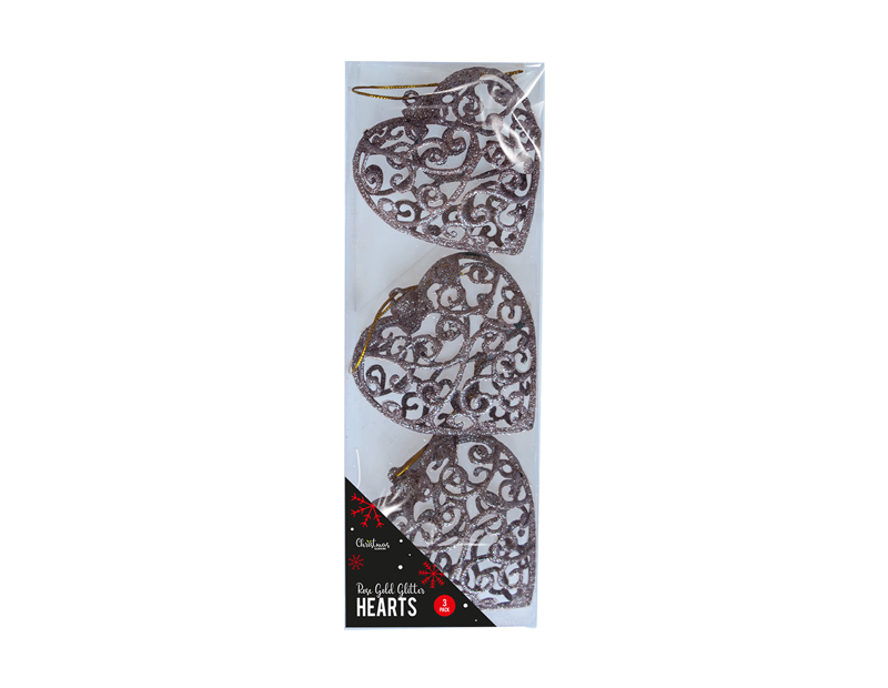 This set of Rose Gold Hanging Hearts contains three individual heart shaped decorations that have been designed in a traditional Christmas style.