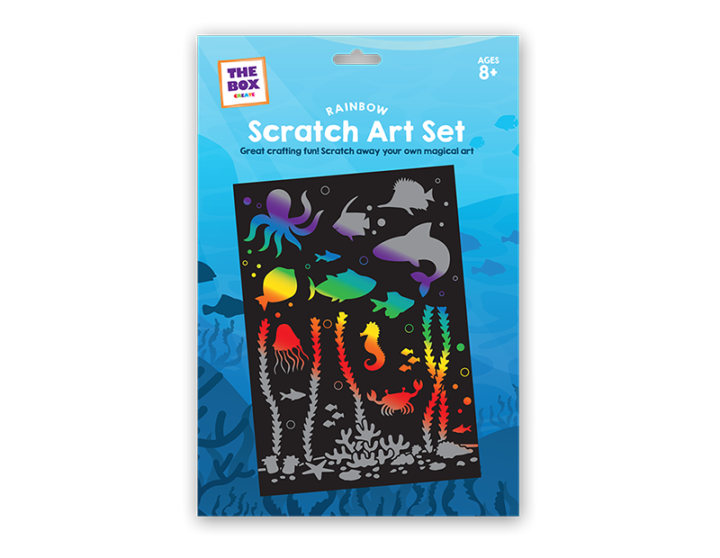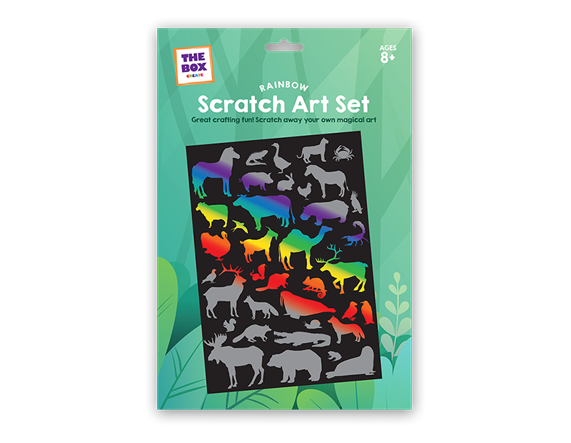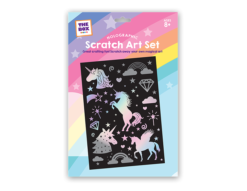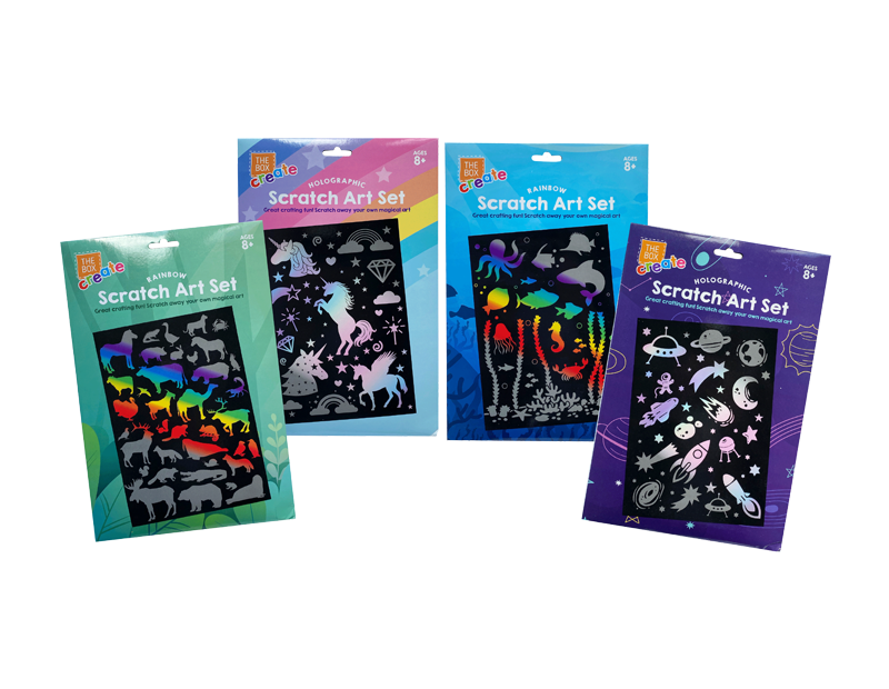 These Scratch Art Sets each contain a sheet of rainbow or holographic paper that has a removable black top coating and a scratching tool.