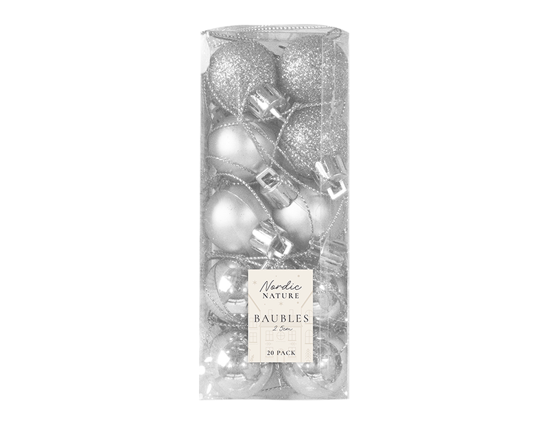 The pack contains a mixture of shiny, matte and glitter baubles in silver; each measure 2.5cm in diameter and come complete with a matching colour hanging thread.