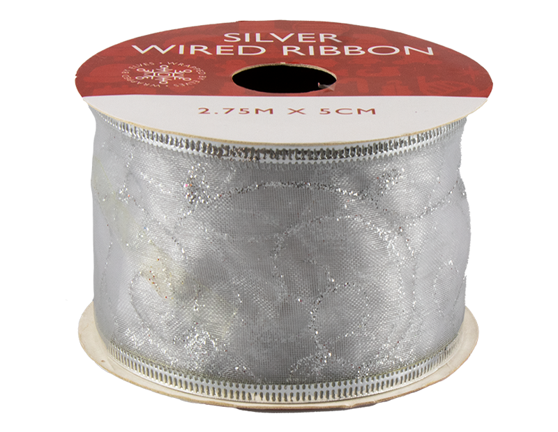 These rolls of Silver Christmas Wired Ribbons are 2.75 meters in length x 5cm in width and feature glittered decorative elements.