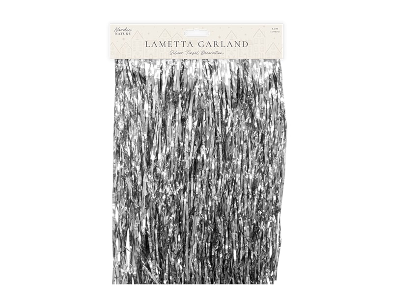 this Silver Lametta Garland is constructed from metallic PVC and has an overall length of 120cm with a height of 46cm.