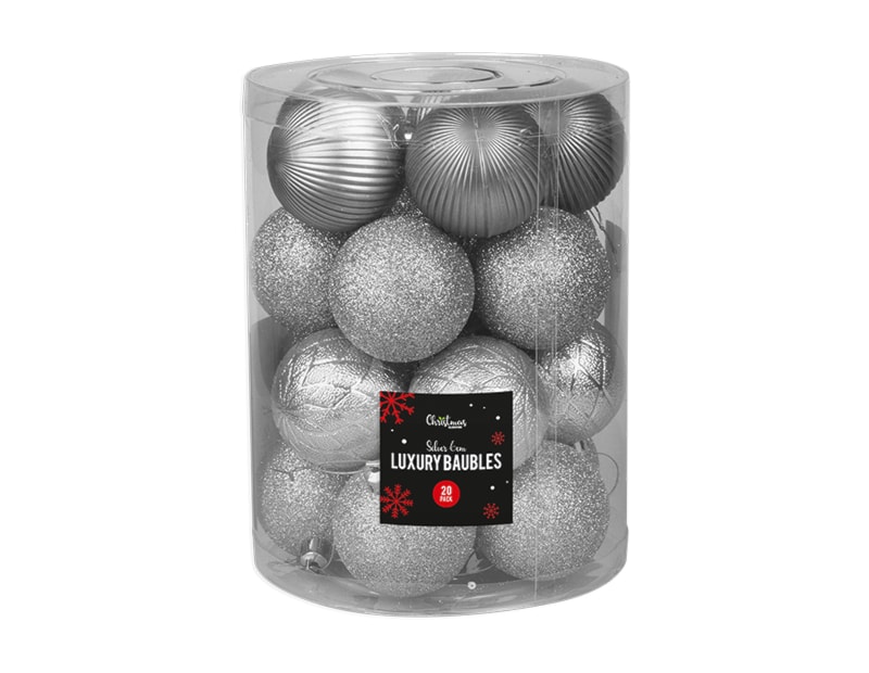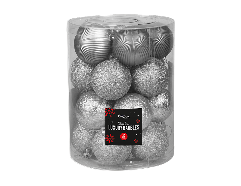 Each pack contains 20 assorted baubles each with a 6cm dia. The box contains a mixture of matte, glittery and shiny silver coloured baubles, each with an attached hanging thread.