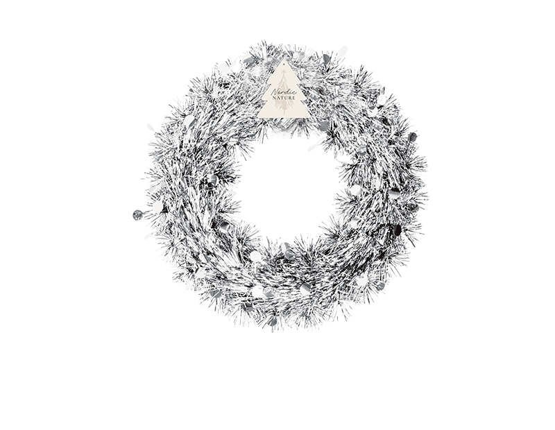 This Silver Tinsel Christmas Wreath features holographic tinsel built onto an internal plastic frame and complete with decorative embellishments.