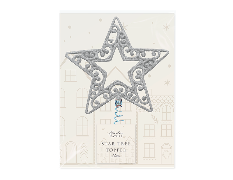 This Silver Tree Top Star stands 19cm in height including the spiral spring. The Silver star features a traditional design with a complete glitter covering and measures 14cm in diameter.