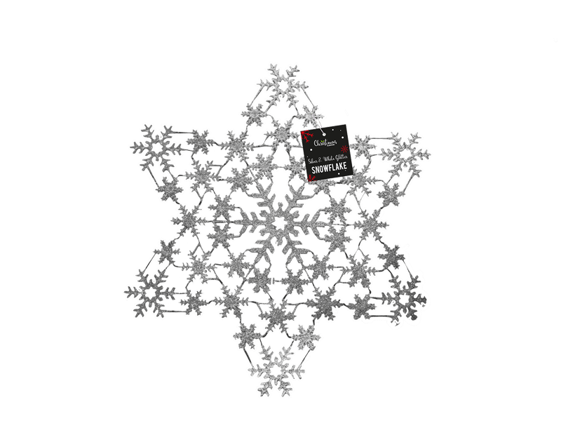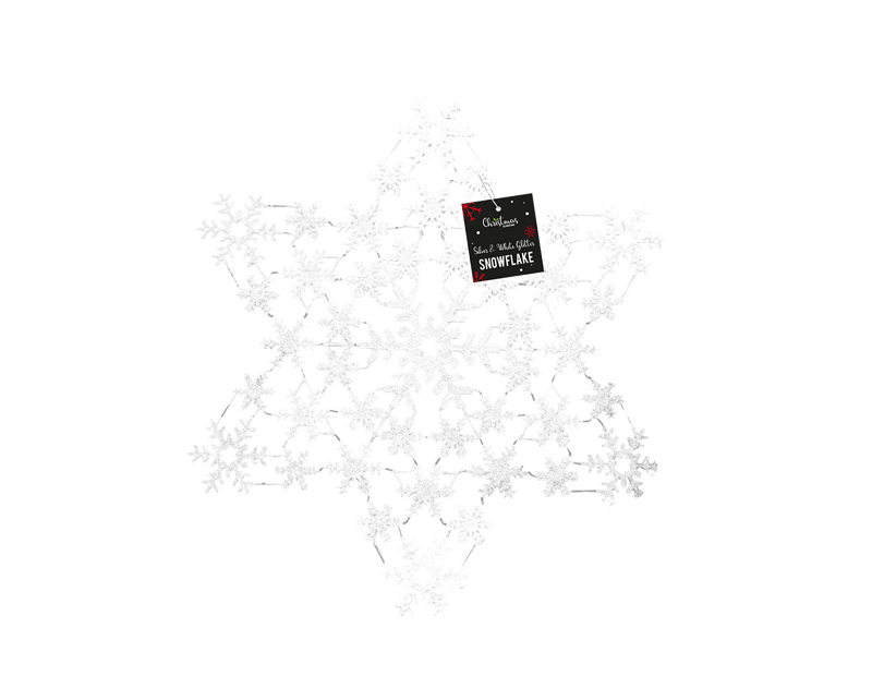 This Silver & White Acrylic Snowflake measures 32cm x 29cm and features a durable acrylic construction with a glittered centre section.