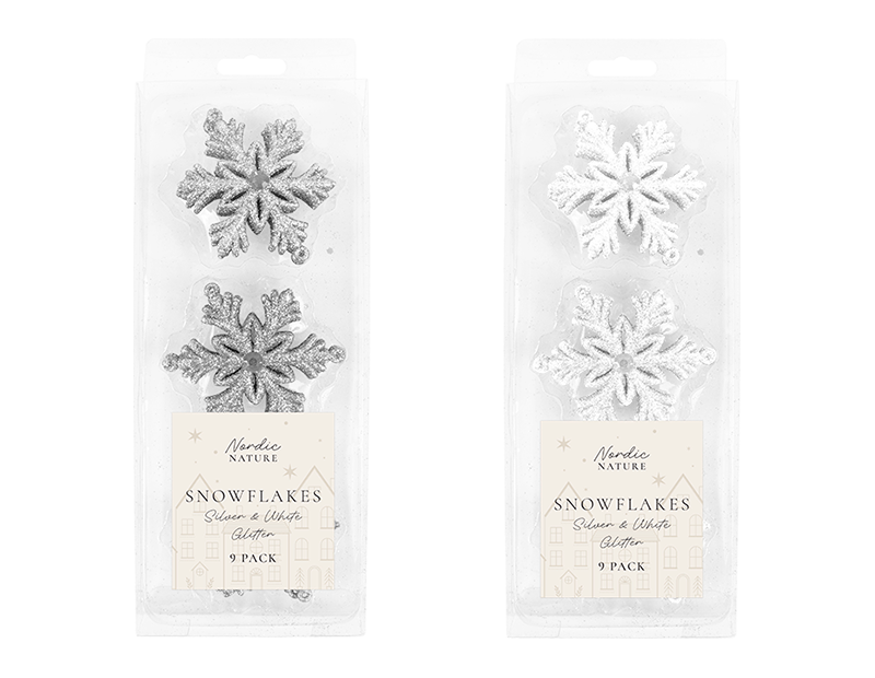 These packs of Silver & White Glittered Christmas Snowflakes contain nine individual snowflakes that have been constructed from durable plastic and feature an attractive glitter coating.
