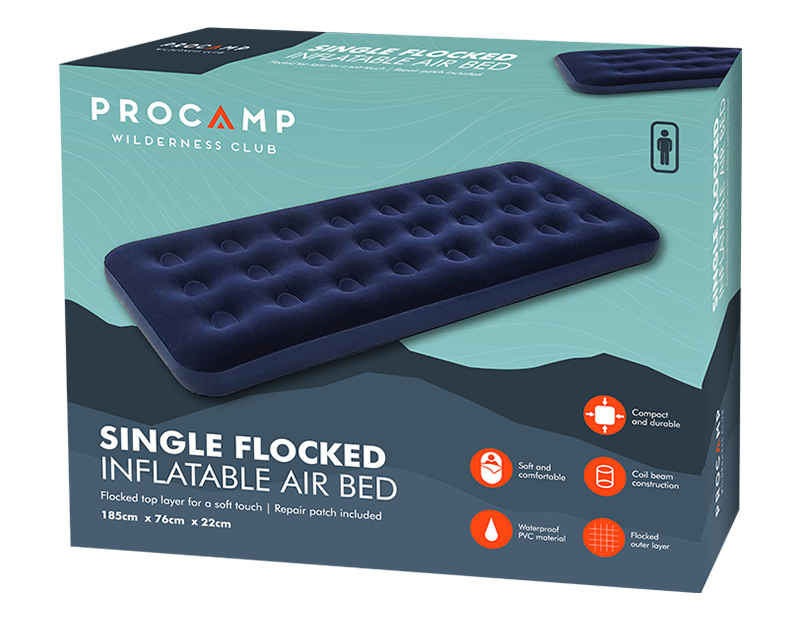 Easy to use single airbed, with a soft flocked finish for comfortable sleeping. Perfect for camping trips or occasional home use. This comfy, coil beam constructed airbed is compact and durable for years of use.