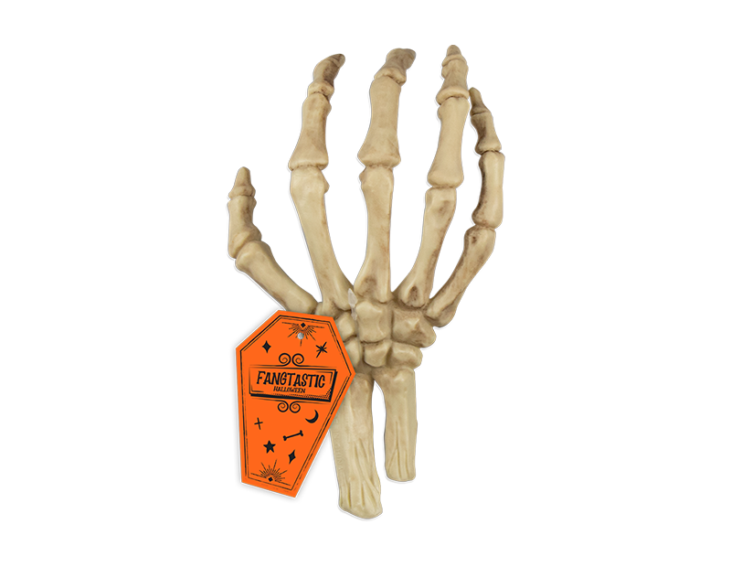 This realistic skeleton hand decoration features a detailed bone structure, and is the perfect addition to any spooky display. Ideal for Halloween table decorations, window displays or as a hanging decoration.