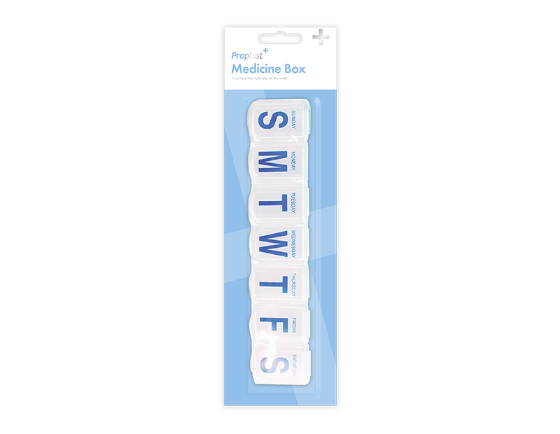 The medical box is constructed from plastic and features seven separate compartments for each day of the week.