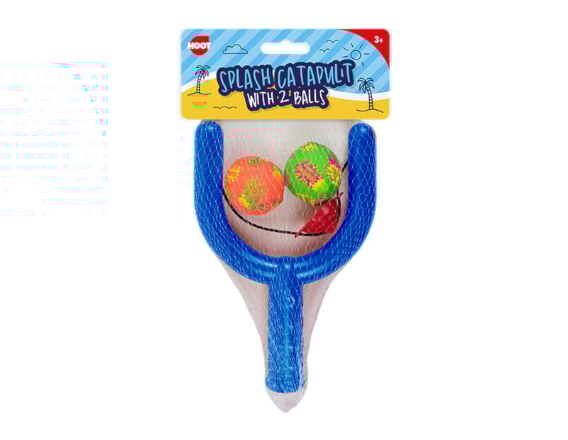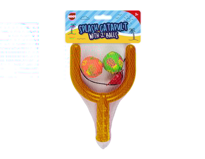 Each pack contains a catapult and two water balls. The balls can be soaked in water and then fired from the catapult.