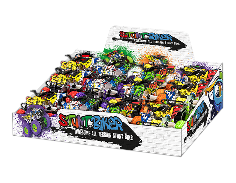 Each bike features street-style artwork designs and bright neon wheels. Each carton has an assortment of four colour quad bikes.