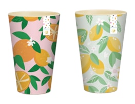 These summer party leaf cups & swirly straws are constructed from food-safe plastic and feature a vibrant fruit print on both sides of the cup. Perfect for Summer parties or celebrations.