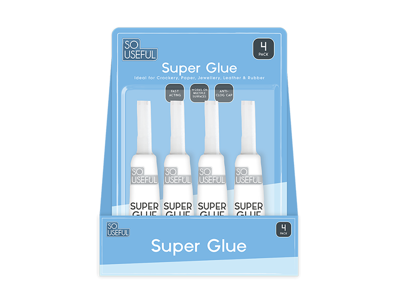 This pack of Super Glue contains four 3-gram tubes of glue that can be used on multiple surfaces, including crockery, paper, jewellery, leather, rubber and more for fast-acting adhesive needs.