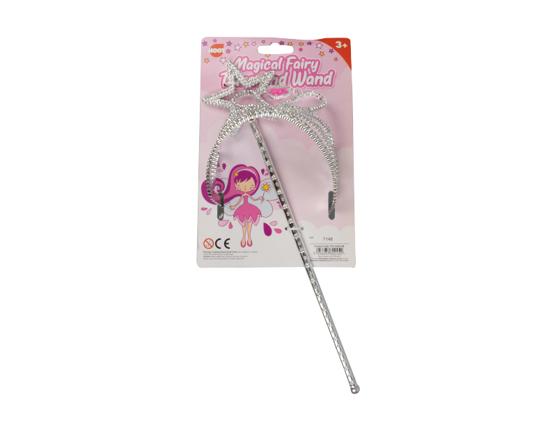 This Tiara & Wand Dress Up Set contains a 34cm silver fairy wand and a silver tiara that features attached decorative jewels.