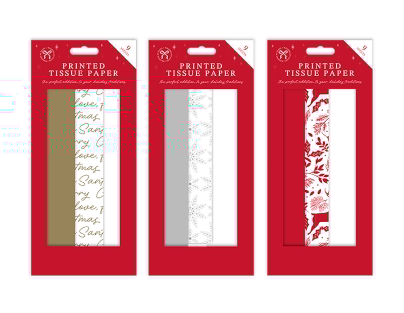 This pack of Christmas Tissue Paper contains nine individual sheets of paper that each measure 50cm x 60cm each. Pack features three assorted designs, two plain colours and one patterned.