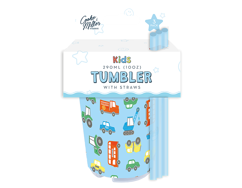 Each pack comes with 3 blue tumbler cups that are printed with a fun transport design, each with a matching blue lid and straw.
