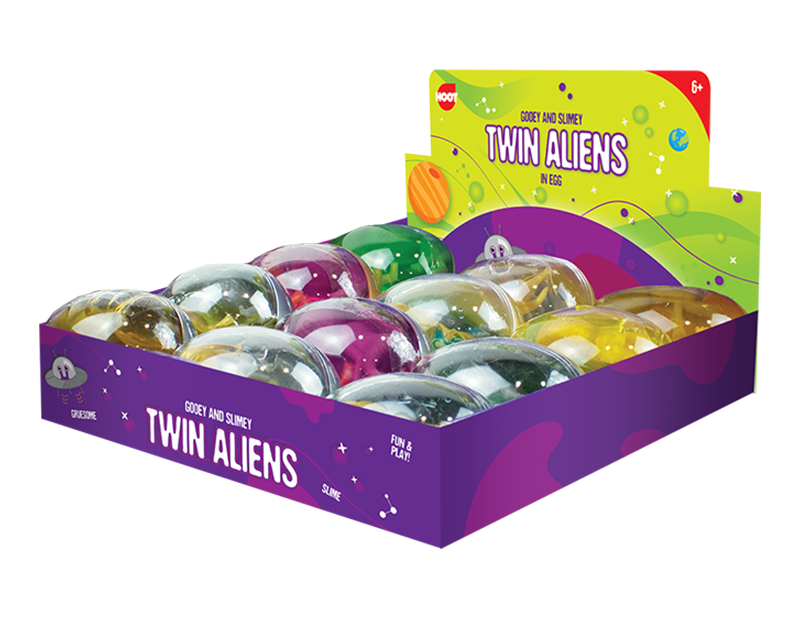 This Twin Alien Toy consists of a gooey filled egg that contains two small alien toys. Each alien toy is manufactured using safe and non-toxic materials and is suitable for children aged six and over.
