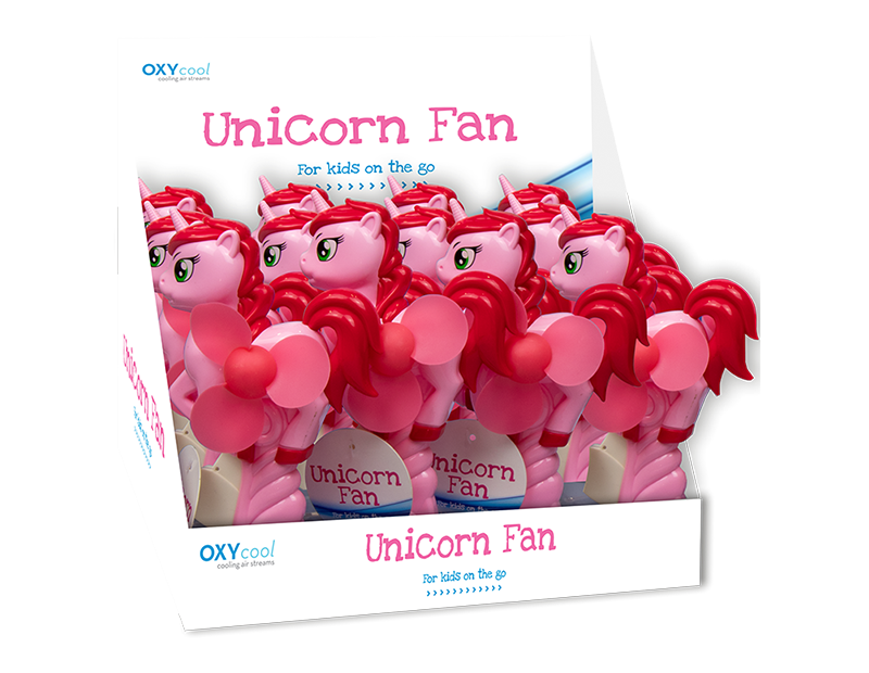 These unicorn fans are great for kids during the summer months. Each handheld fan features a novelty fan. To activate squeeze the crank located on the side of the handle.